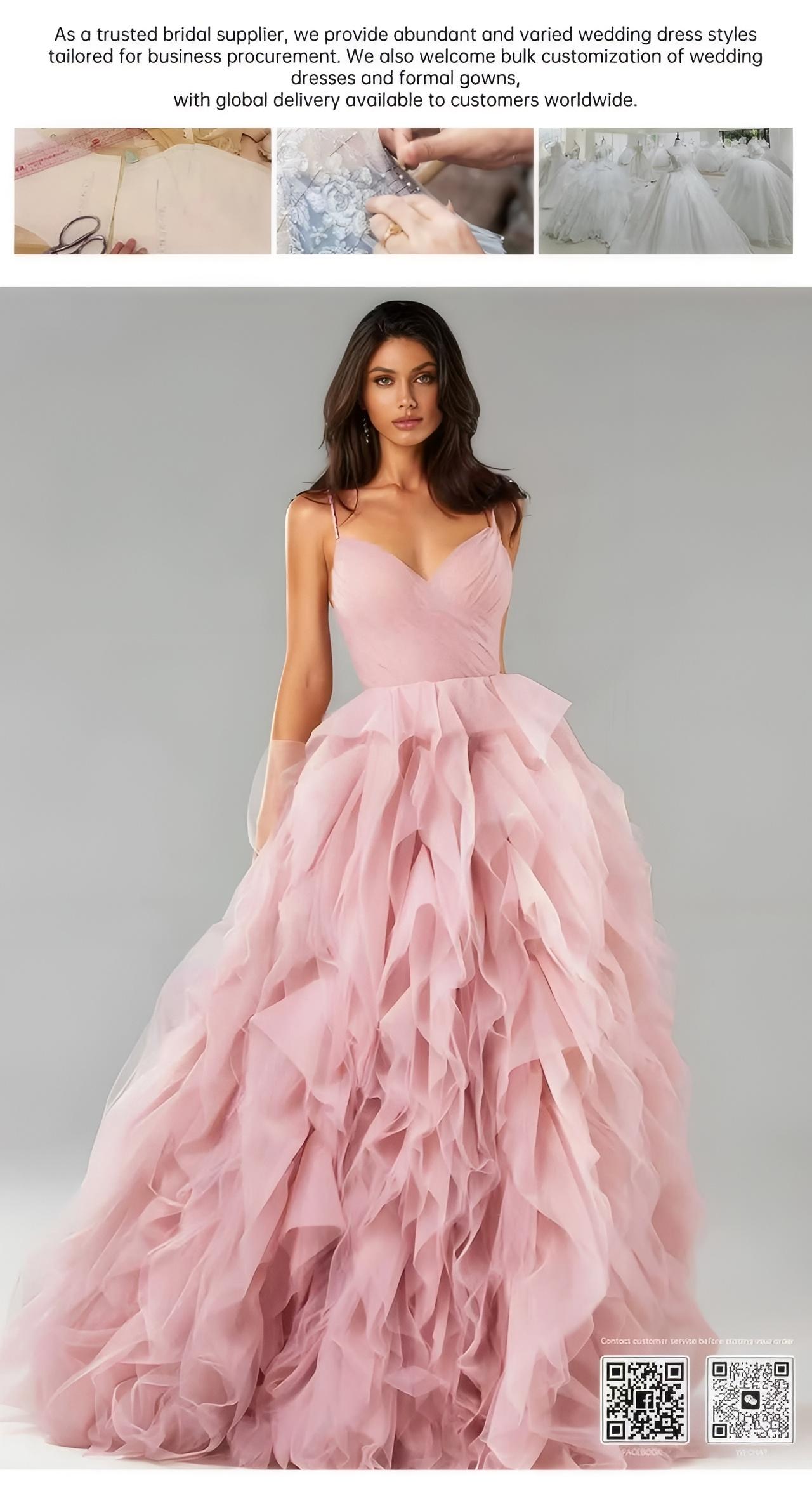 Indulge in ethereal elegance with this blush pink tulle evening gown—featuring delicate spaghetti straps, a plunging V-neck, and cascading ruffled tiers that create a dreamy, voluminous silhouette. Perfect for weddings, proms, or formal galas, its lightweight fabric and romantic design ensure you stand out with effortless charm. Available in versatile hues to match any occasion.
