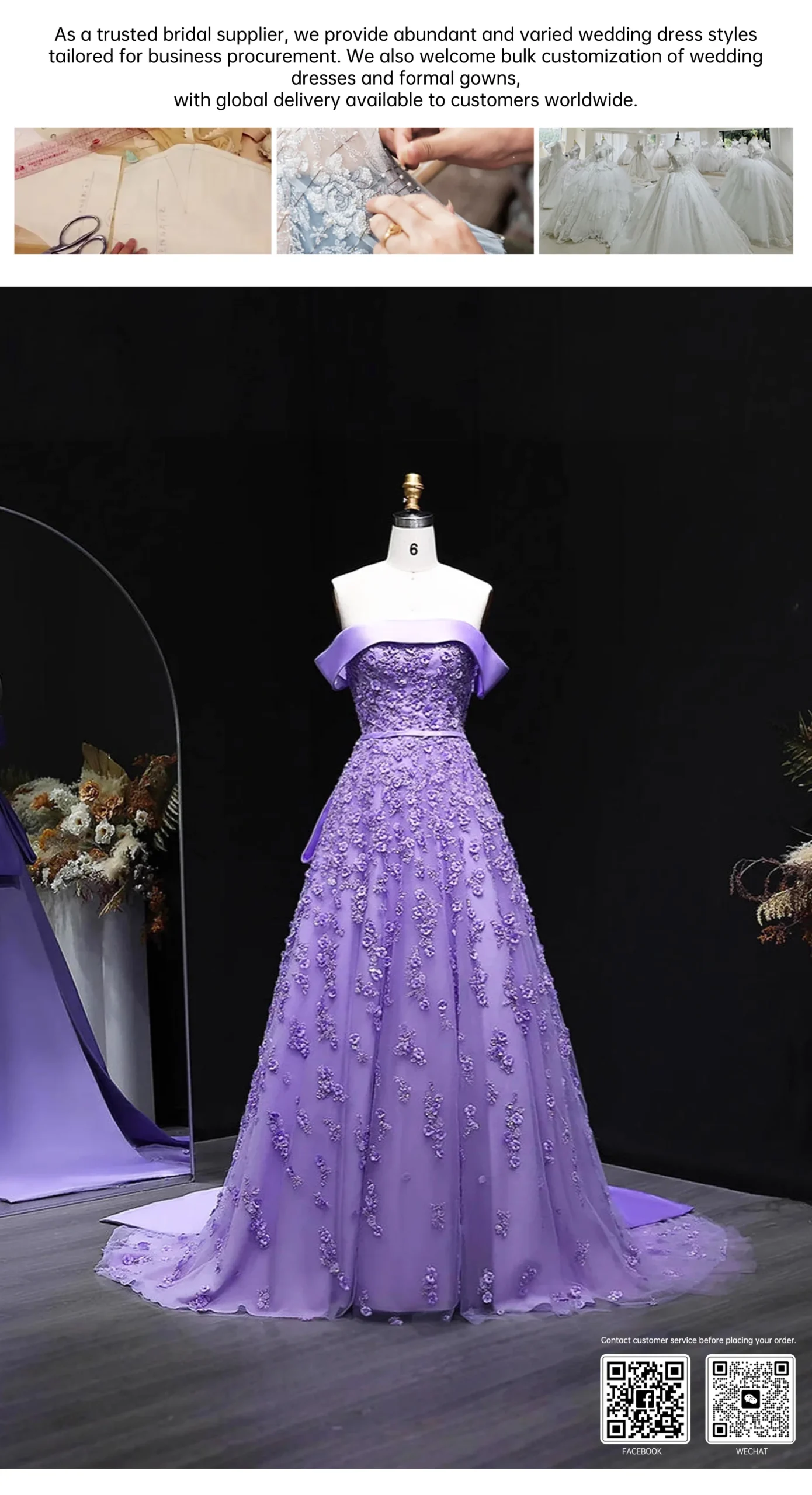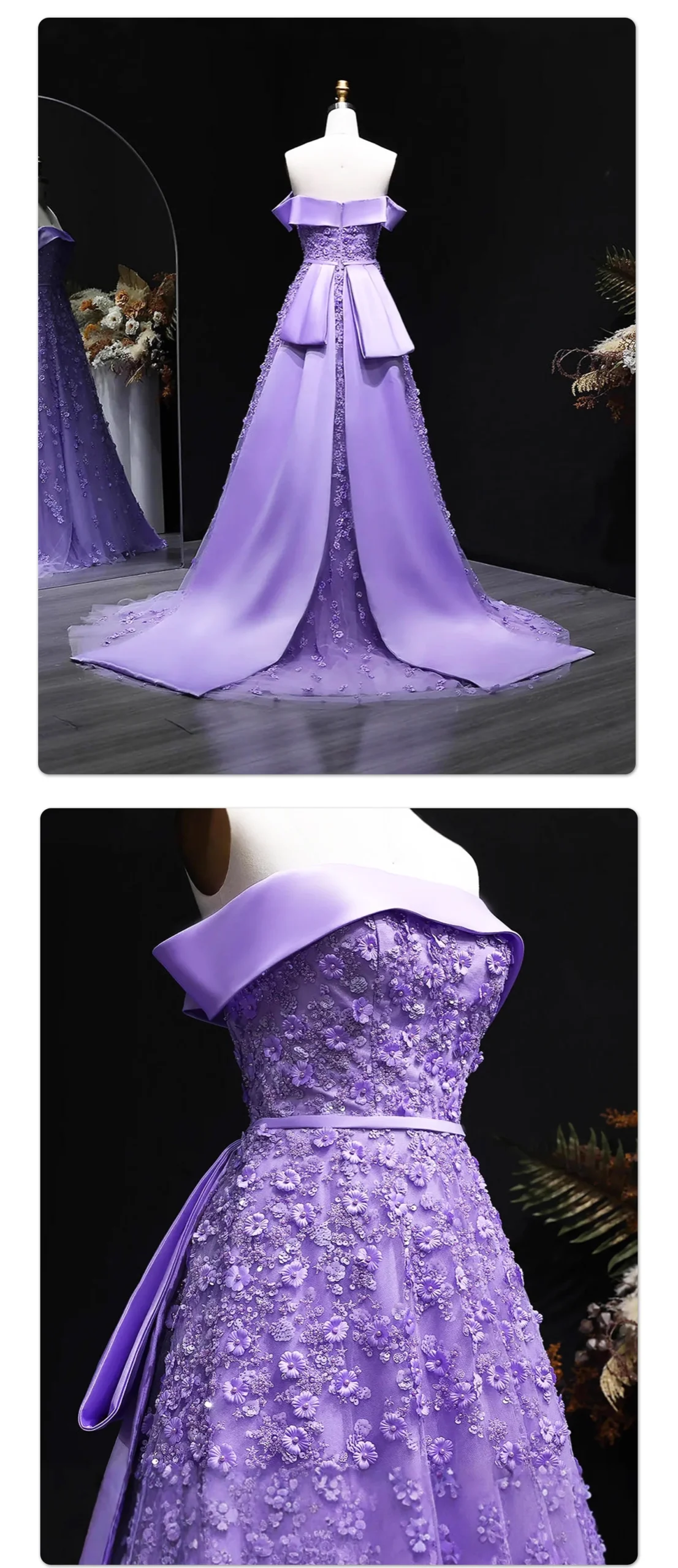 The off-the-shoulder design highlights the shoulder and neck lines, the large bow on the back inherently carries a sweet element, the dress features delicate shimmering embroidery plus a long train, and when walking, it looks like wrapped in a layer of dreamy purple yarn.