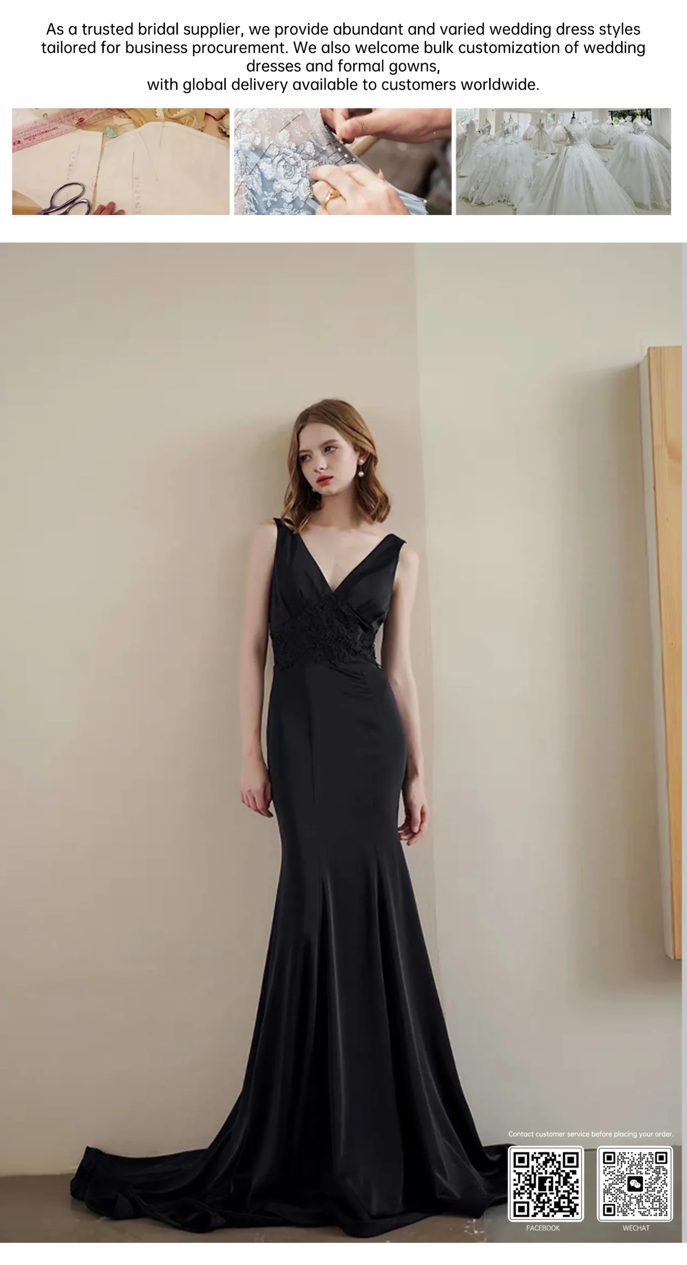A deep V-neck + lace-trimmed bodice add elegant detail, while the slim-fit mermaid silhouette hugs curves perfectly. The smooth satin fabric and subtle train make it ideal for American-European parties, runways, or gala events.