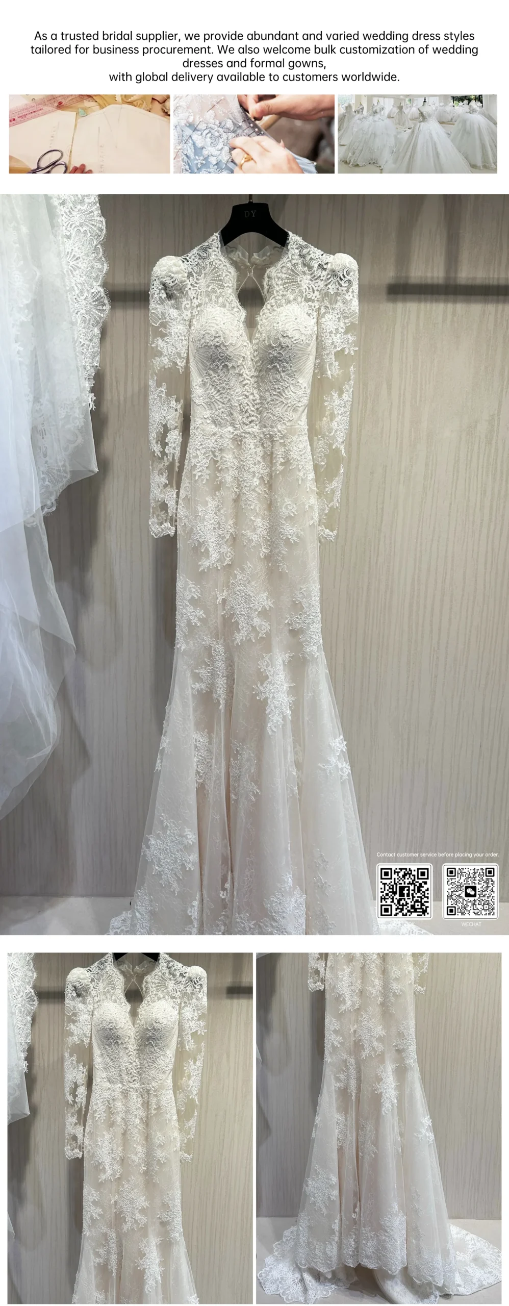 High-Neck Sheer Long-Sleeve Bridal Gown with 3D Embroidery