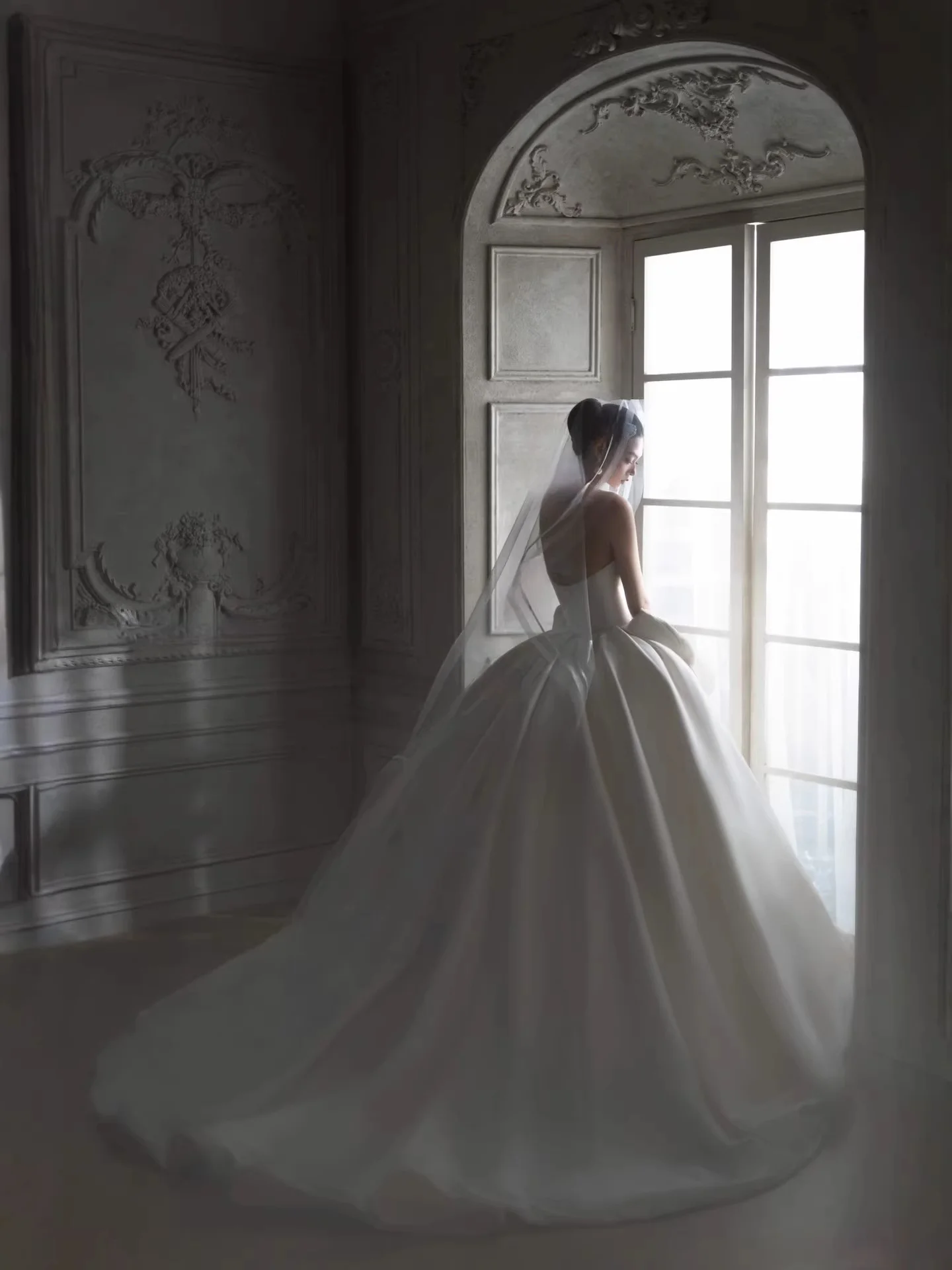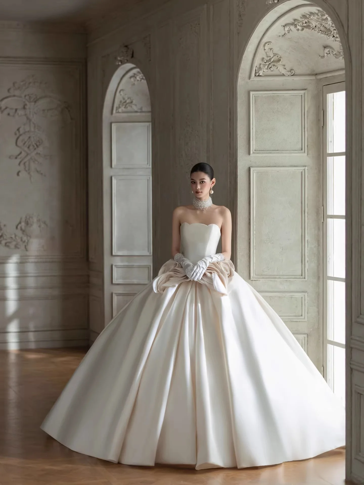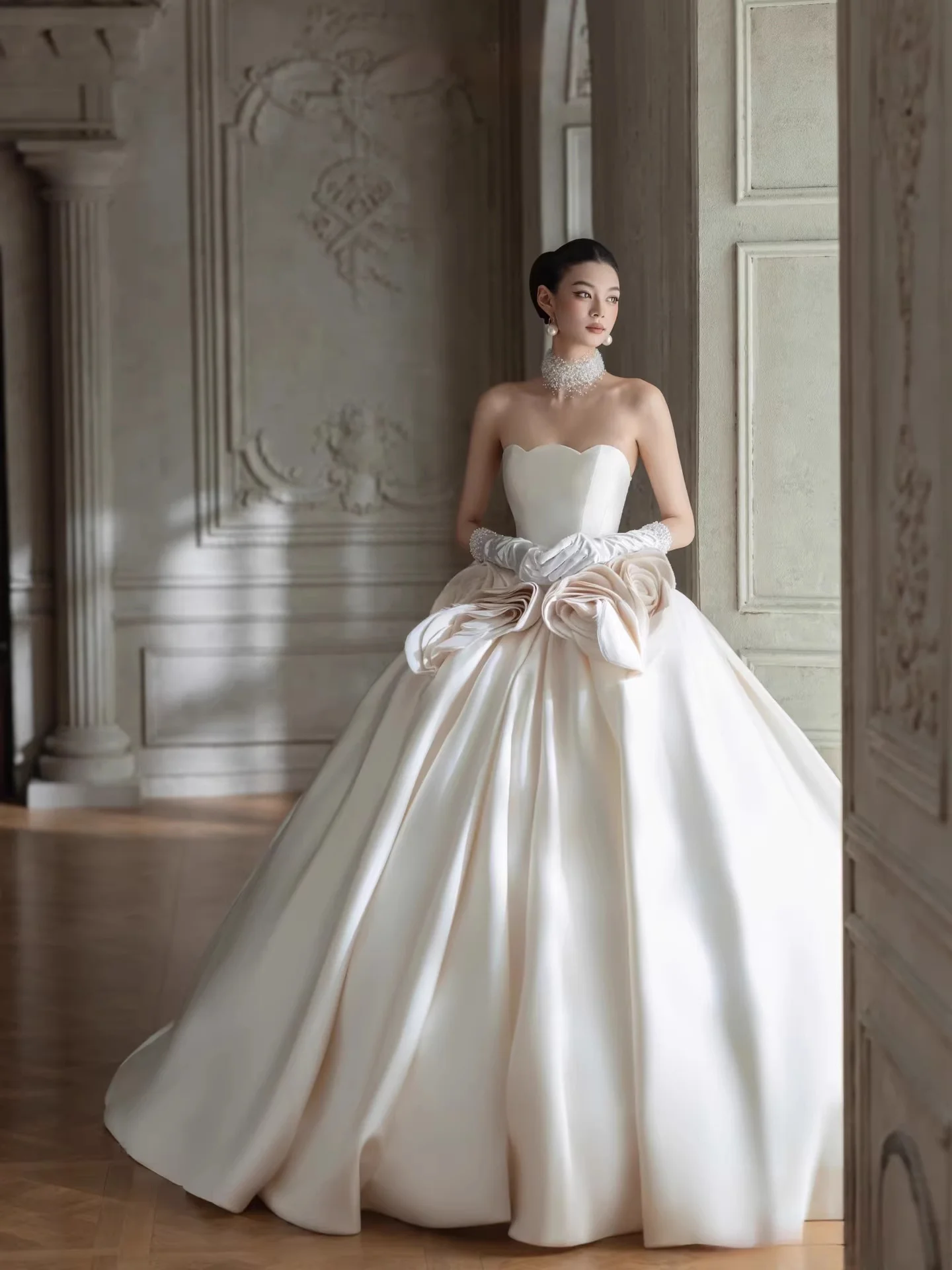 Luxury Strapless Satin Ball Gown Wedding Dress with 3D Rose Detail, Elegant Bridal Gown