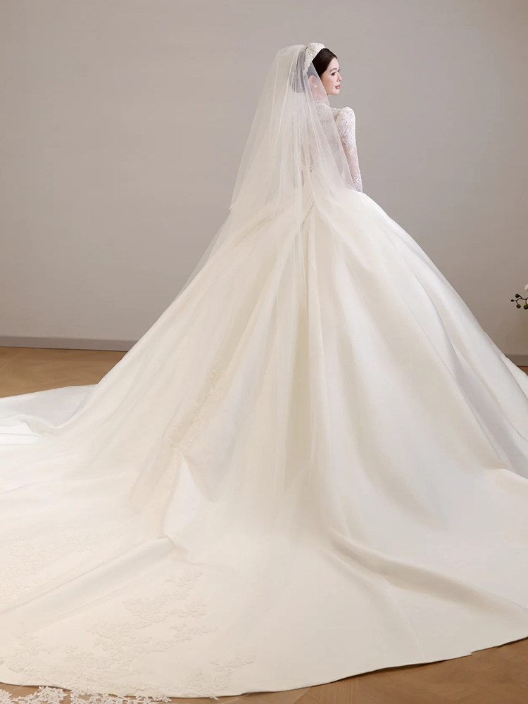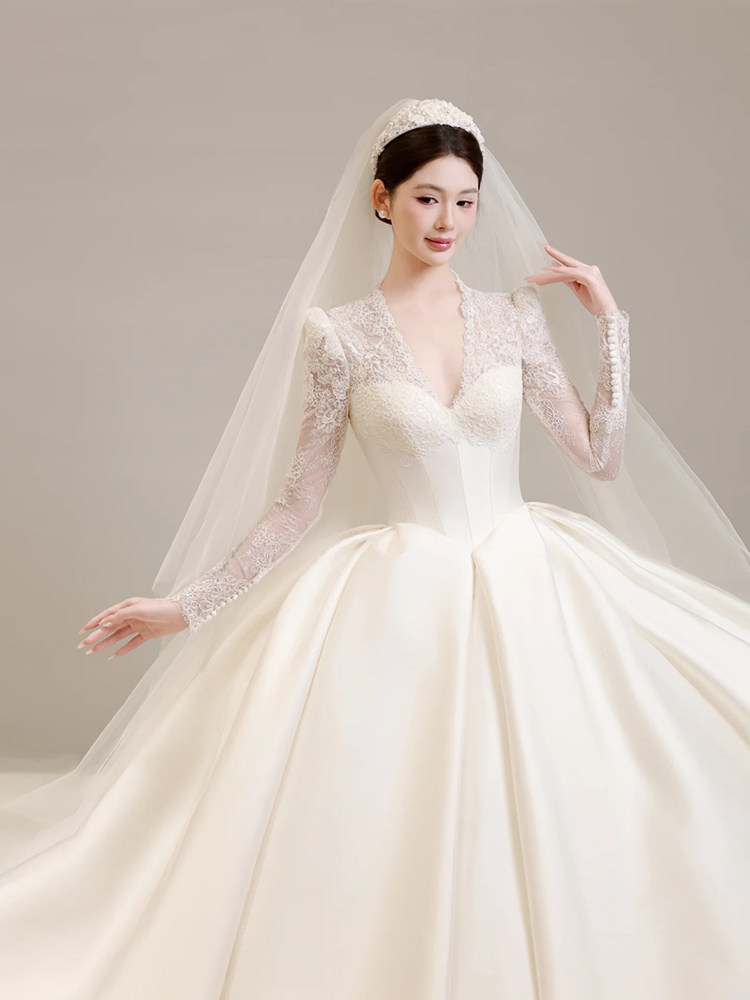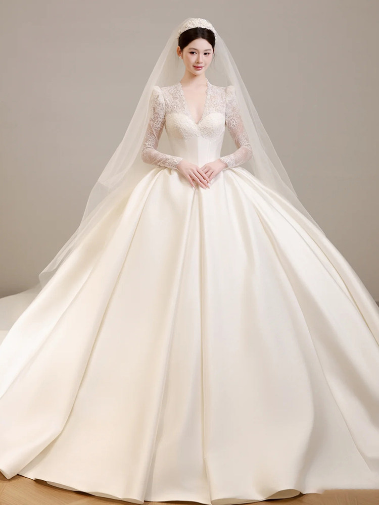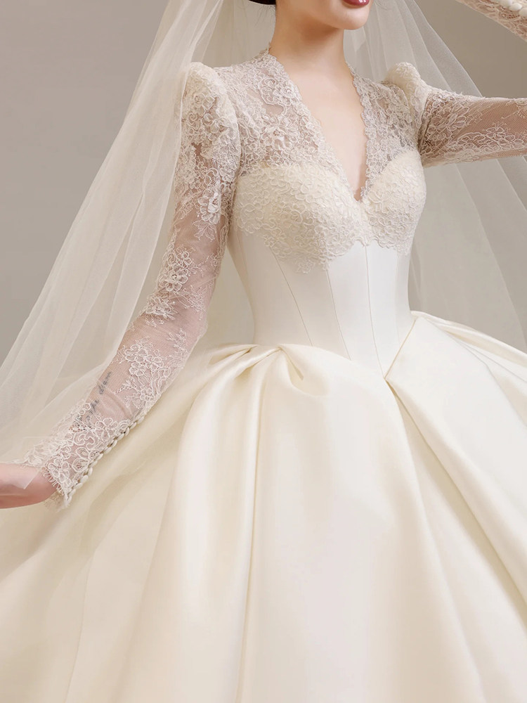 Modest Satin Ball Gown Wedding Dress with Long Lace Sleeves V-Neck Bridal Gown with Train