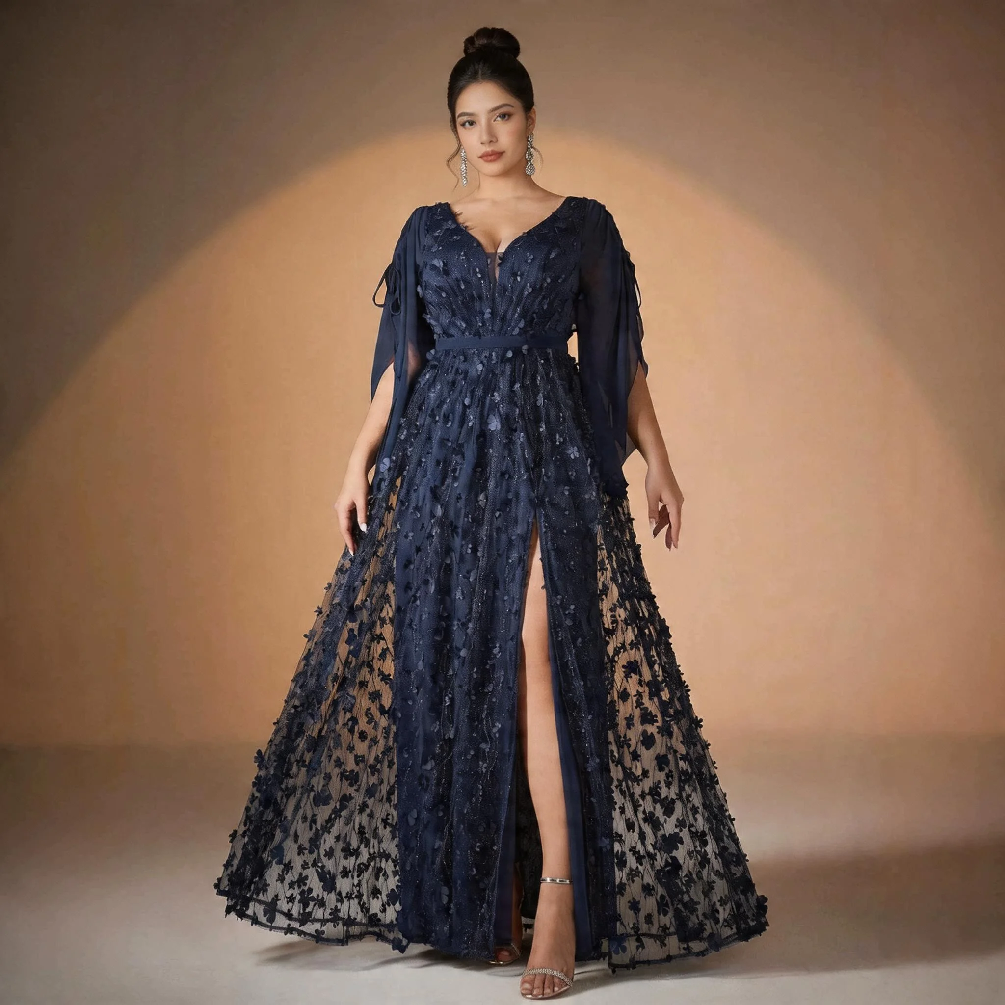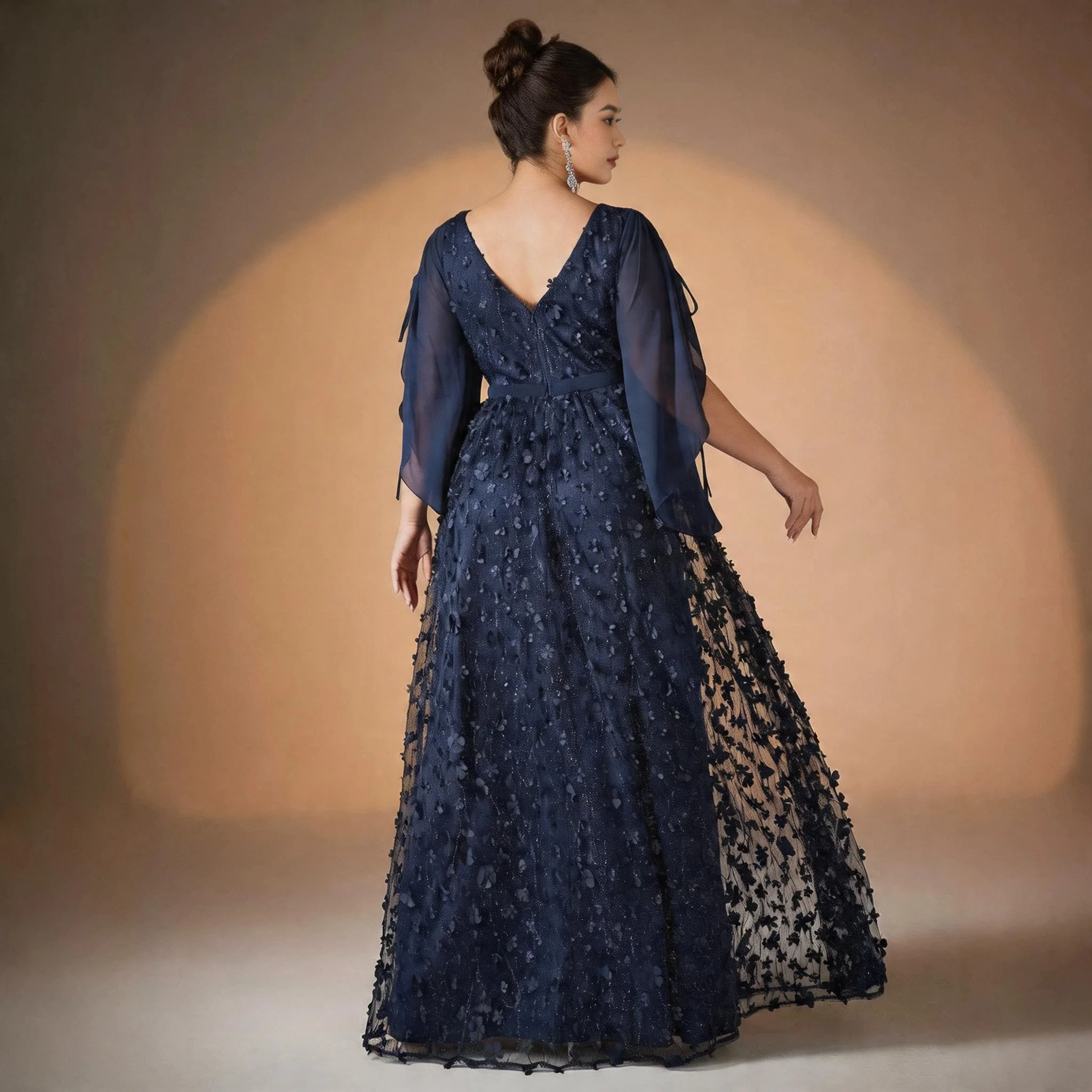Navy Floral Tulle Evening Dress with Cape Sleeves