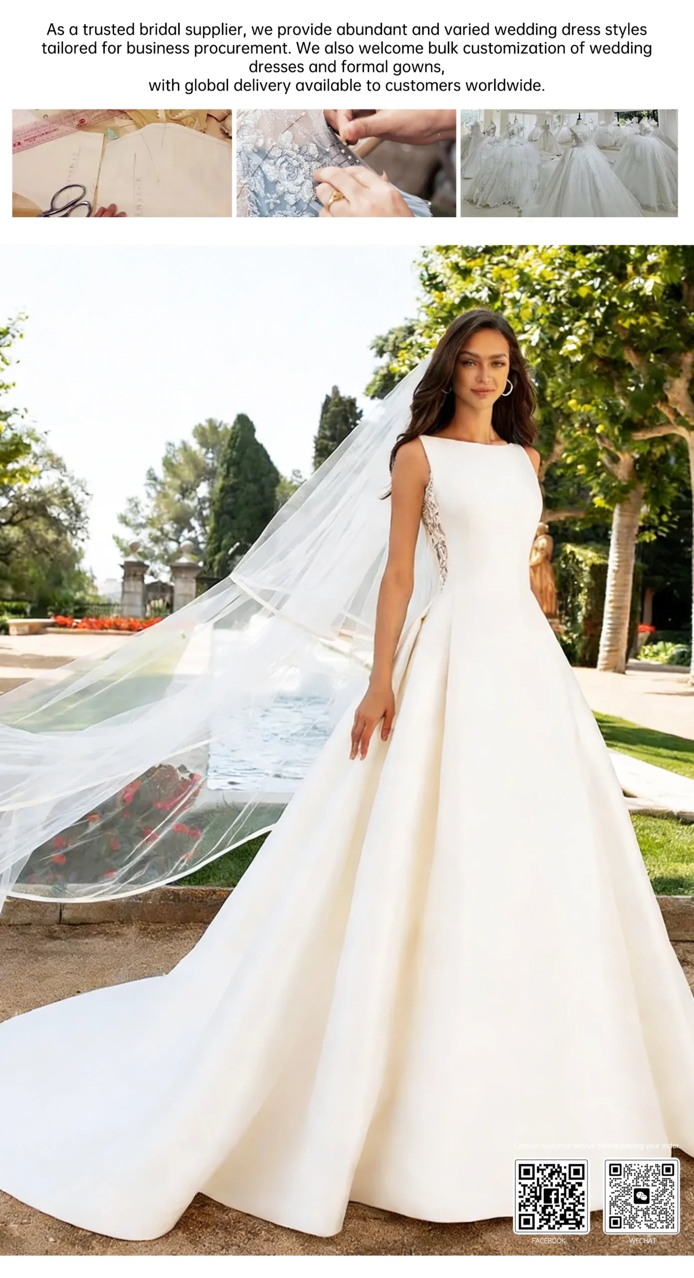 Featuring sleeveless design and exquisite lace accents on the back, the satin fabric exudes a natural, elegant sheen. The full skirt is paired with a cathedral train, offering a perfect blend of vintage romance and ceremonial grandeur, making it ideal for garden or French-style weddings. Custom sizing is available to ensure a perfect fit that delivers a look of understated luxury.