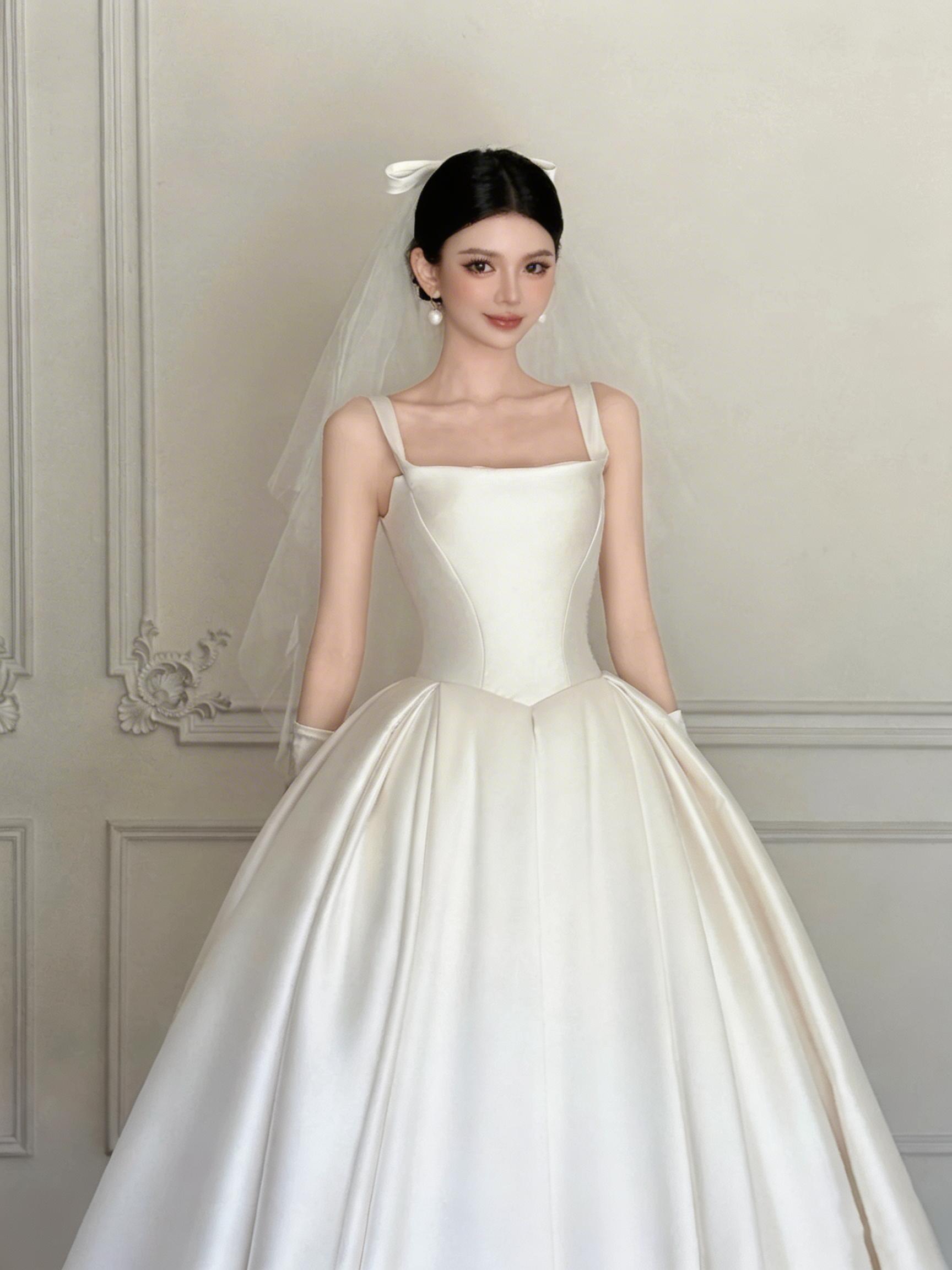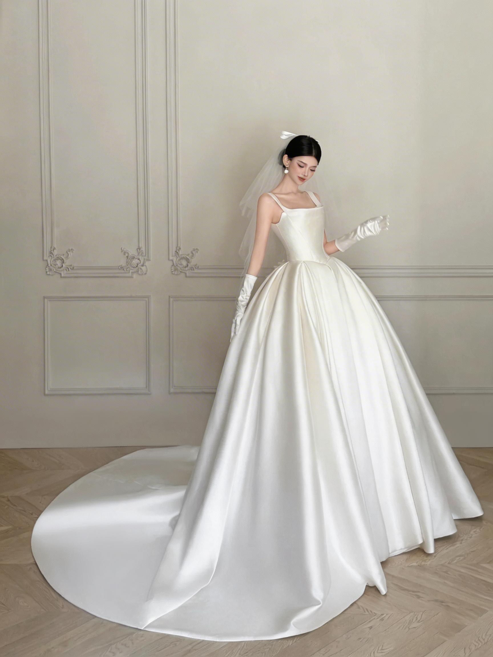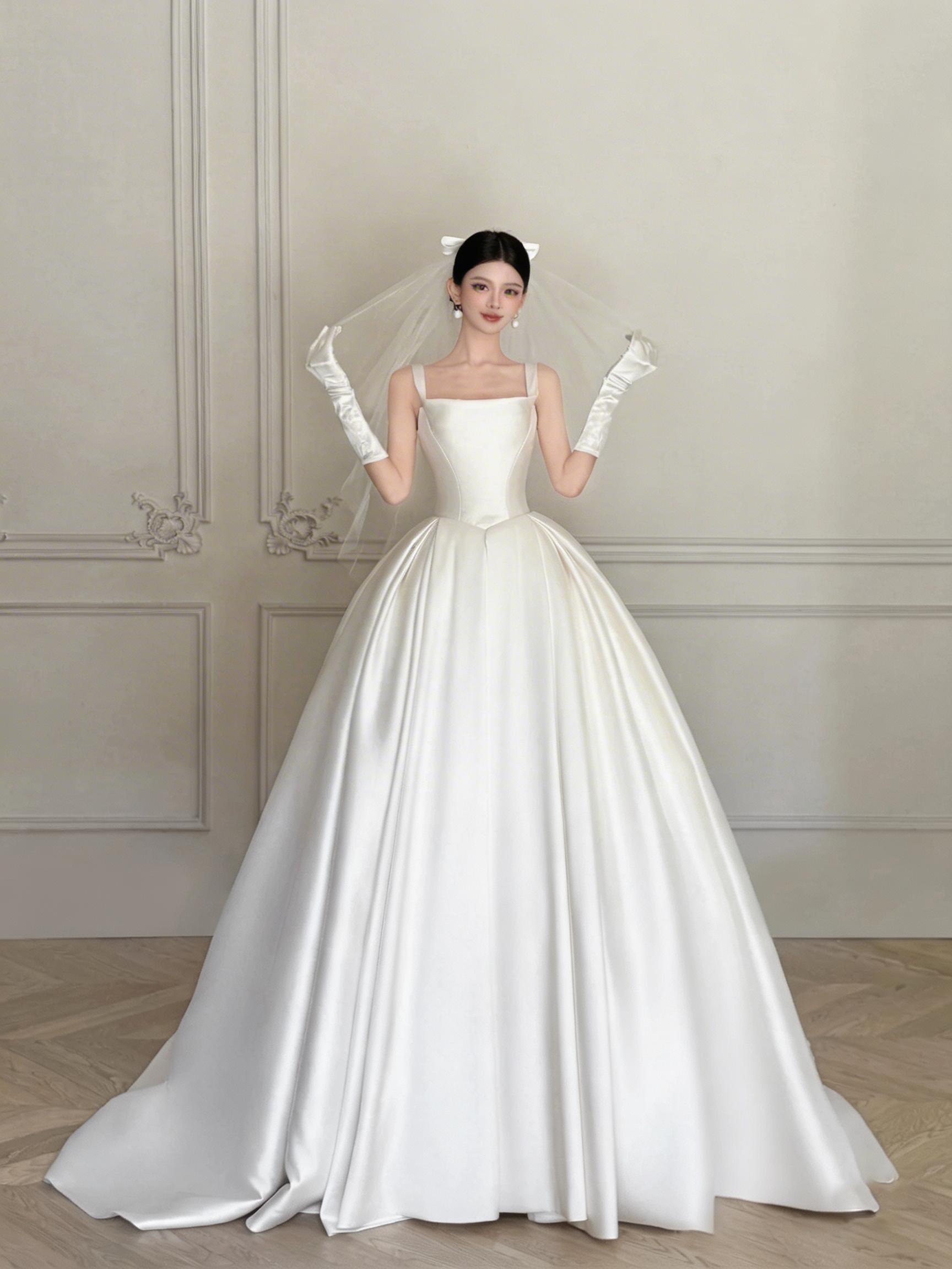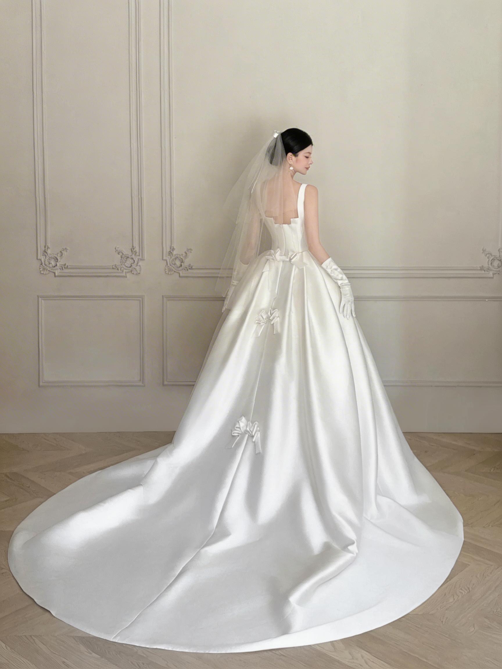 White Satin Ball Gown Wedding Dress with Square Neck, Bow Back & Long Train